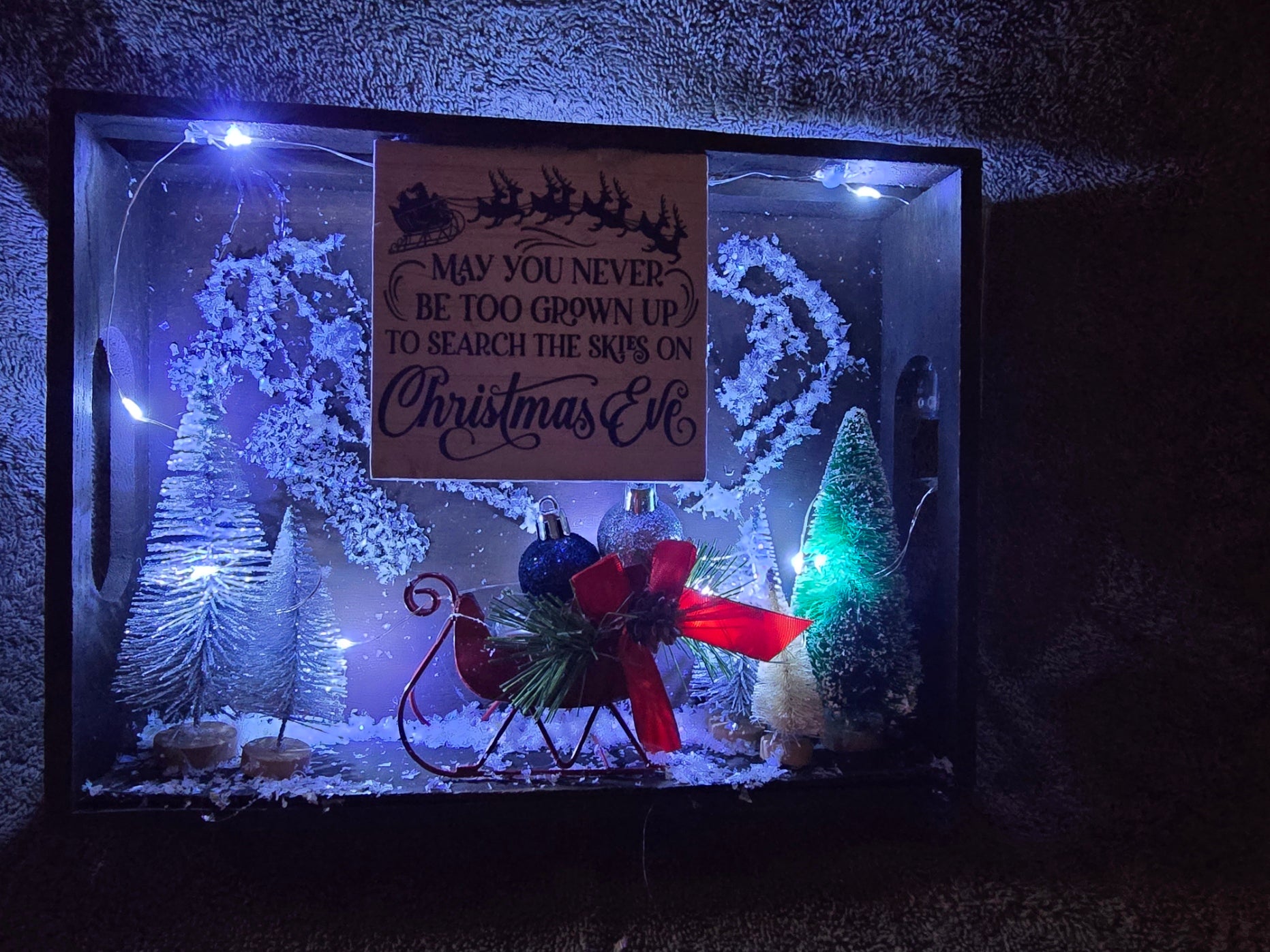 Capture the magic of Christmas Eve with this enchanting shadow box featuring Santa's sleigh soaring through a winter landscape dotted with evergreen trees. Hand-crafted with meticulous attention to detail, this festive display piece brings nostalgic charm to any room. The layered design creates stunning depth, showcasing Santa's iconic journey across the night sky. Perfect for holiday décor, this timeless keepsake reminds us that wonder never fades—no matter our age. An ideal gift for collectors and Christmas enthusiasts who cherish the spirit of the season.